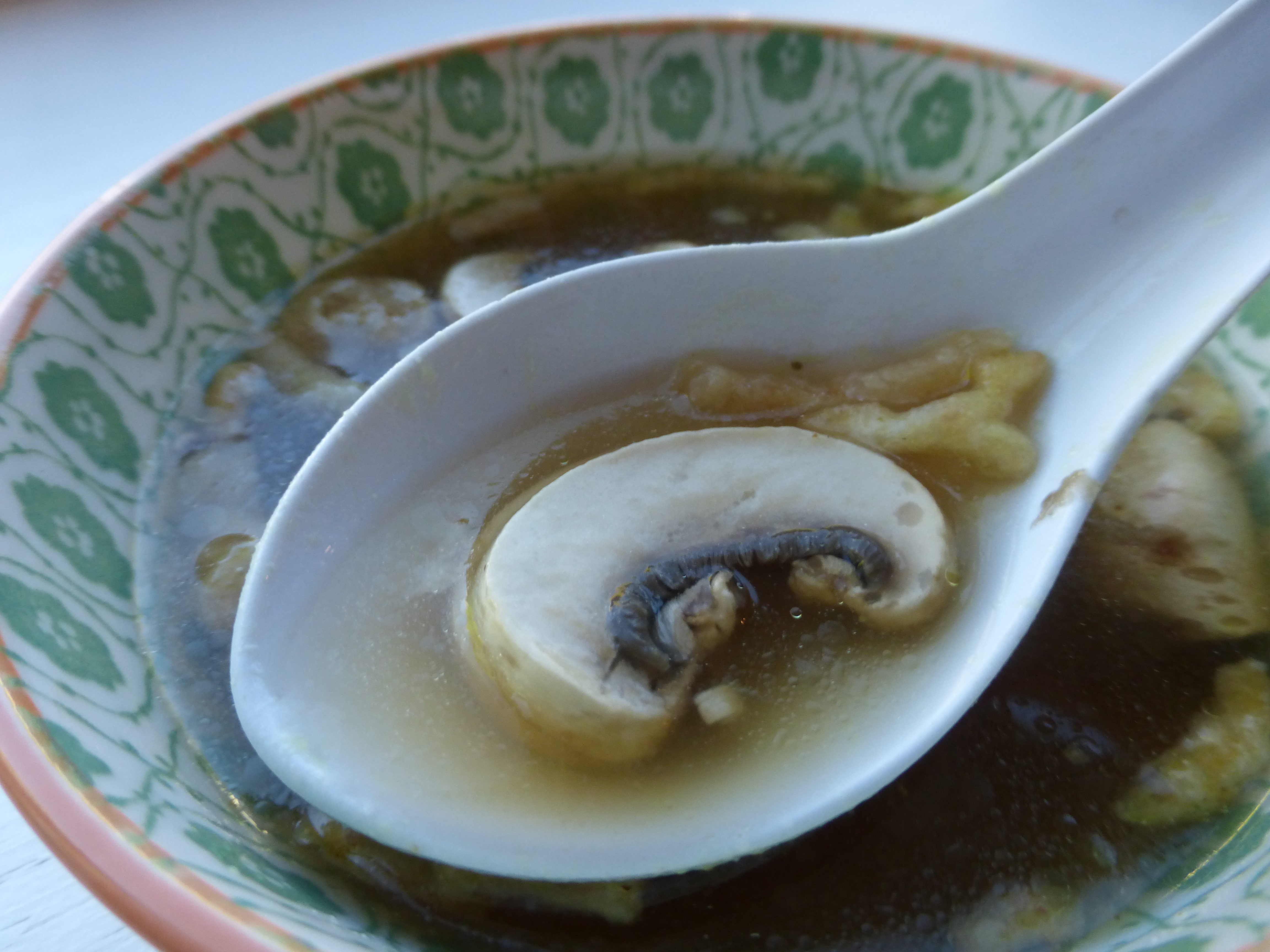 1 celery stalk 1 small onion 2 carrots Canned French fried onions 1 small piece fresh ginger (about 1 inch long) 3 garlic cloves 2 large beef bouillon cubes 2 large chicken bouillon cubes 2 cups thinly sliced mushrooms 8 cups water Cut the celery, onion and carrots in fourths and add to the water in a large stock pot. Cut the ginger and garlic into a few pieces each and toss into the water, along with the bouillon cubes. Cover the pot and bring to a boil; reduce heat and simmer for a least an hour. Strain the vegetables, discarding them and leaving just the broth. Add the sliced mushrooms and simmer a few minutes more. Serve with a few French fried onions sprinkled on top.
